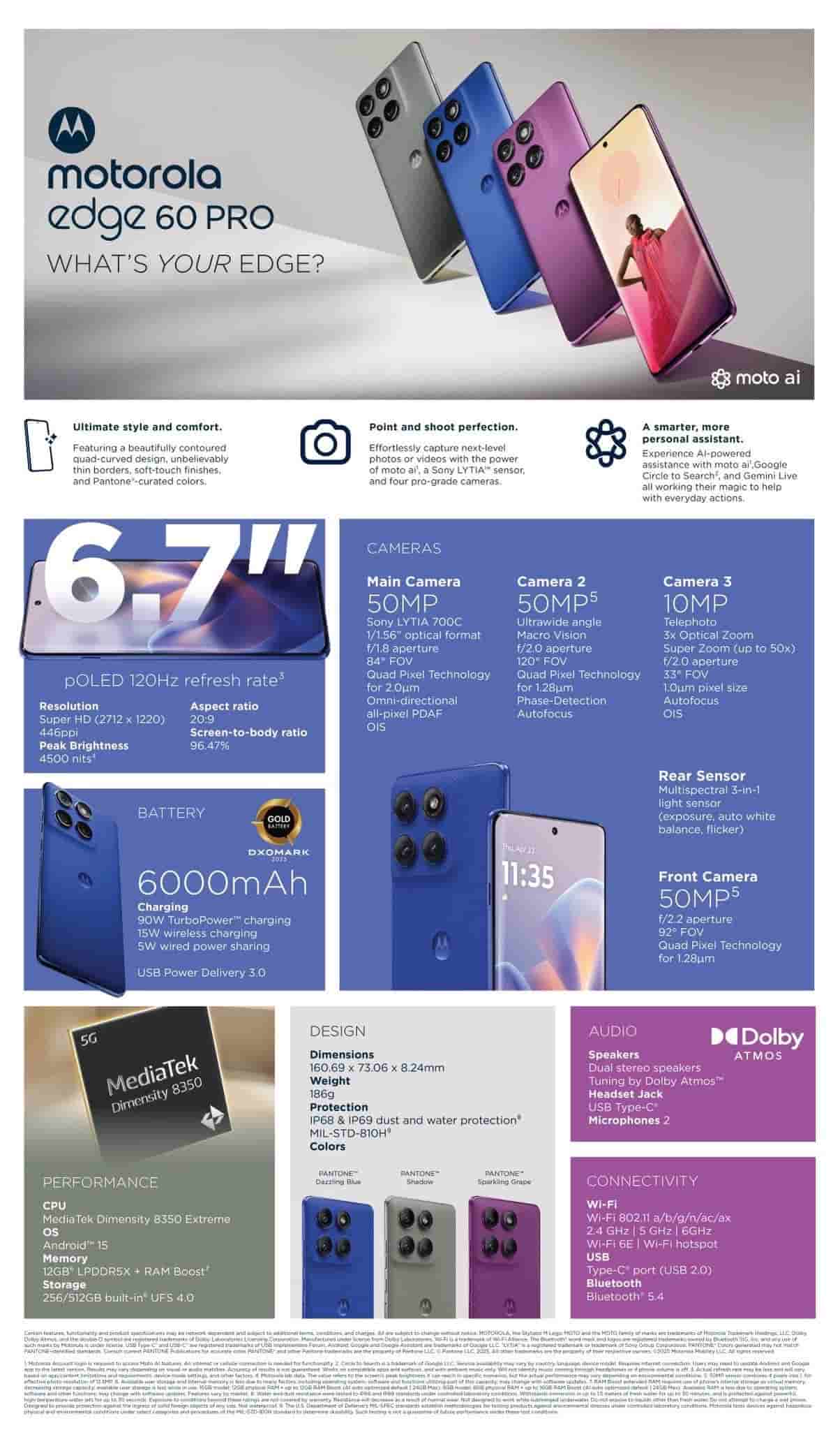 The newly-launched Motorola Edge 60 Pro smartphone is powered by the MediaTek Dimensity 8350 Extreme chipset, and it is coupled with LPDDR5X RAM and UFS 4.0 storage. It is integrated with the ARM Mali-G615 MC6 GPU and runs on the Android 15 operating system, with promised 3-year OS upgrades and 4-year security updates. Two storage models are available for the device – 8GB/256GB and 12GB/256GB.