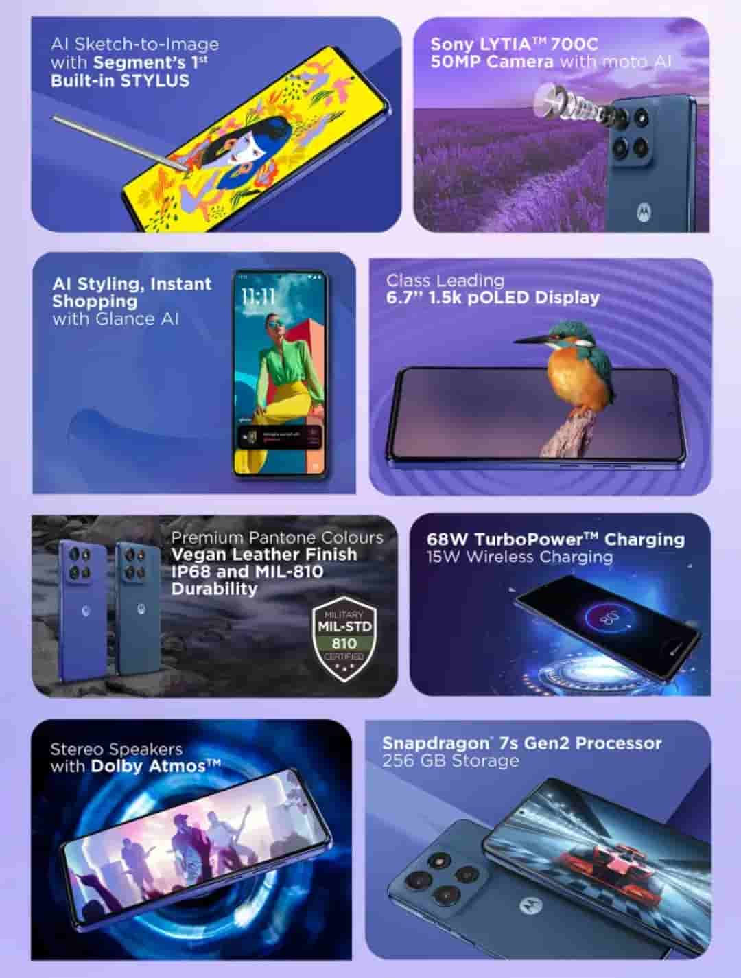 It features a 50MP Sony LYTIA 700C main camera, a 13MP ultra wide camera, and a 3-in-1 sensor on the rear side, while on the front it packs up 32MP selfie camera. It comes with IP68 underwater protection and MIL-810 certification. The smartphone is backed by a 5000mAh battery and supports 65W TurboPower charging and 15W wireless charging. Other features include- Moto AI features, Smart Connect, Stereo speakers with Dolby Atmos, 12 5G Bands+ WiFi 6. It will feature Vegan Leather Design and comes in Surf the Web and Gibraitar Sea color options.