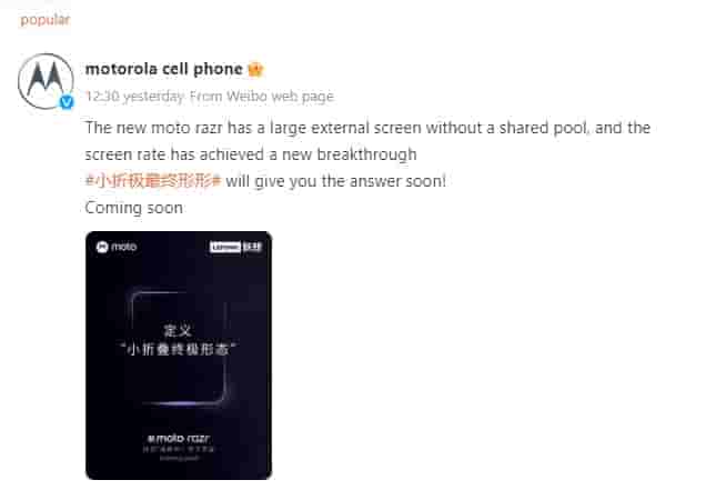 The Chinese teaser poster of the upcoming Motorola Razr 40 Ultra has leaked online with the tagline “Coming Soon”, indicating that the smartphone will soon have its launch in China. The smartphone had also recently made its appearance on the BIS Indian certification website along with Motorola’s Edge 40 smartphone and the device is also going to have its launch in the Indian market as well.