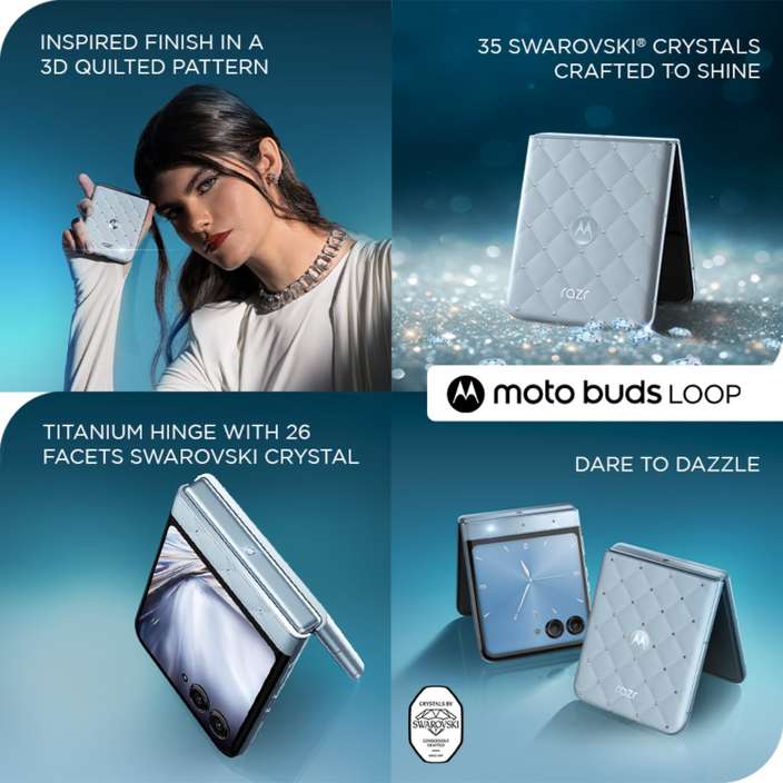 Step into brilliance with the Swarovski x Motorola Collection. The motorola razr 60 with 35 hand-set crystals and the jewellery-inspired moto buds LOOP with Sound by Bose redefine style and sound. Starting ₹24,999. Combo at ₹59,999. Sale starts 8 Sept.