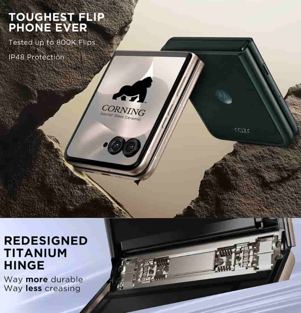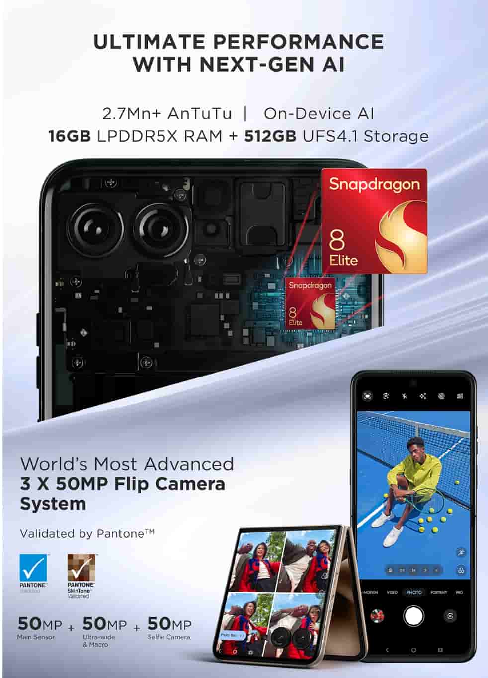 The device will feature the world’s most advanced 3x 50MP flip camera system. It packs a 50MP main sensor and 50MP ultra wide & macro sensor on the rear side, while on the front it features a 50MP selfie camera. It is tested up to 800K flips and arrives with IP48 protection. It features a redesigned titanium hinge, making it more durable and less creasing. The external display is protected with Corning Gorilla Glass Ceramic.