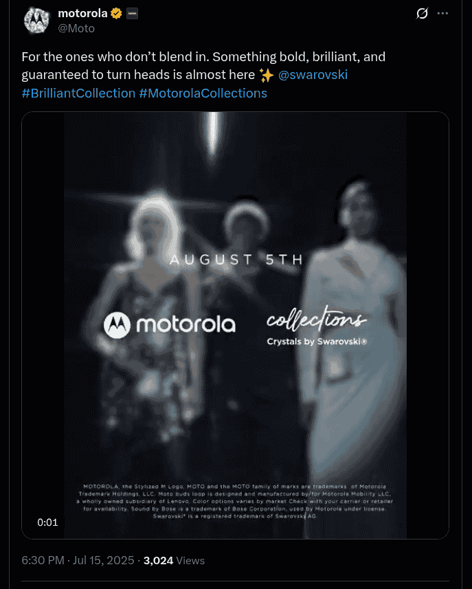 Motorola x Swarovski Limited Edition Razr 2025 and Moto Buds Loop Launch Date Changed? Teaser Video Revealing 15th August 2025 as New Launch Date Shared