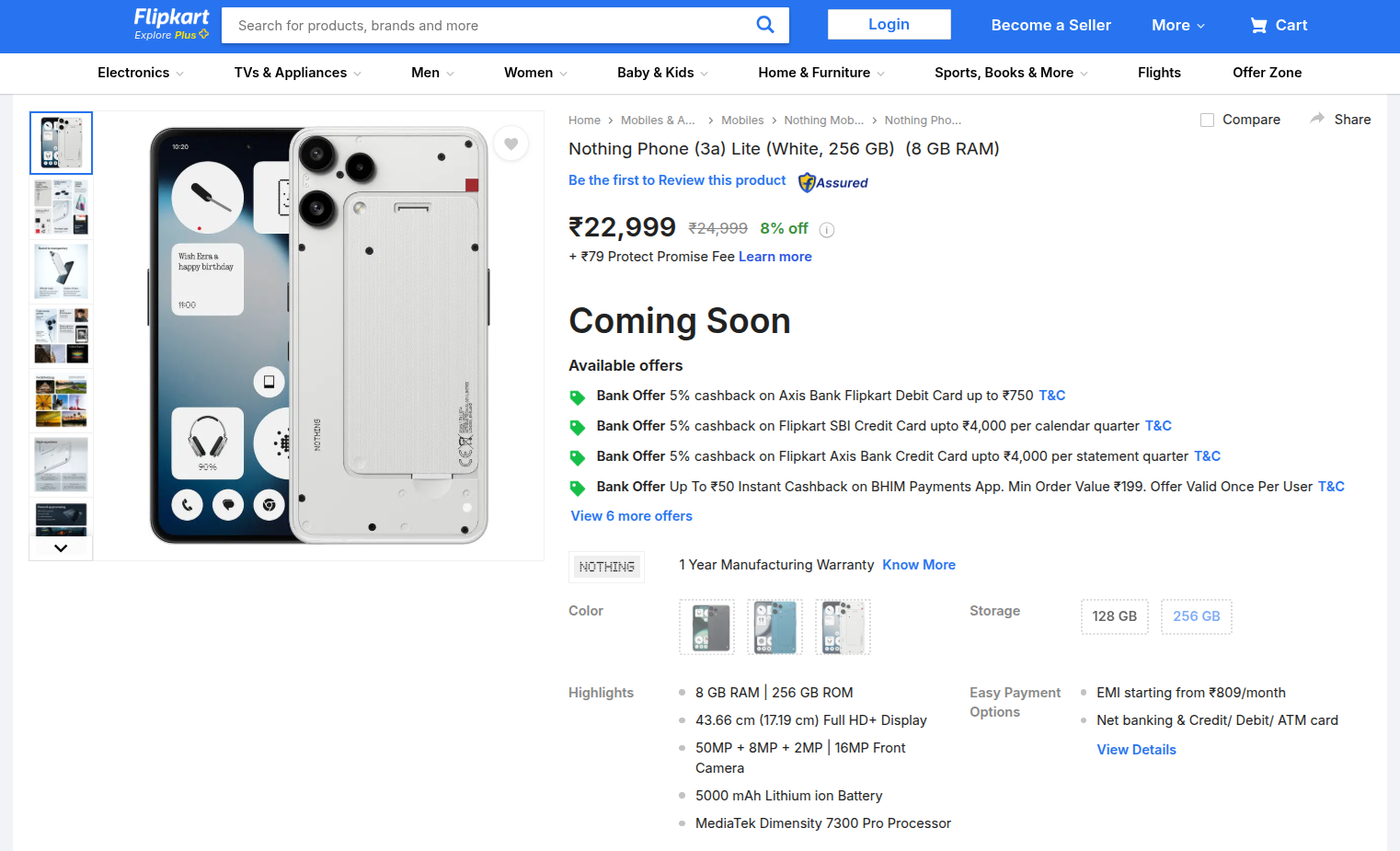 Speaking more, two storage options of 8GB/128GB and 8GB/256GB are available for Nothing’s Phone (3a) Lite smartphone in India, and these are respectively priced at INR 20,999 (actual list price – INR 22,999) and INR 22,999 (actual list price – INR 24,999). However, with the bank offers, customers can purchase it at an effective price from INR 19,999.