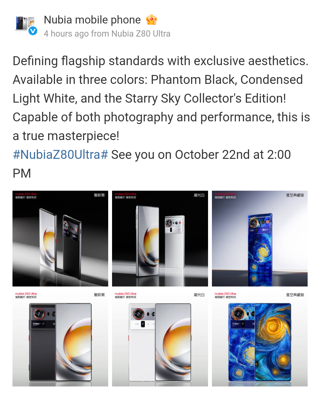 Nubia’s Z80 Ultra smartphone is scheduled to make its debut in the Chinese market two weeks later on the 22nd of October 2025, at 2PM local time, and it will be made available to customers in three different colors of Starry Sky Collector’s Edition, Phantom Black, and Condensed Light White. This latest flagship marks the brand’s thirteen years of imaging experience and will be offering enhanced performance capability.