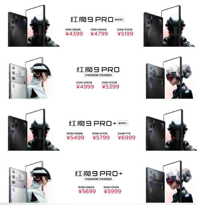 The Red Magic 9 Pro+ smartphone has 16GB/256GB, 16GB/512GB, & 24GB/1TB storage options for the Dark Knight model, with price points of ¥5499, ¥5799, & ¥6999 respectively. The Deuterium Front Transparent Dark Night only has the 16GB/256GB & 16GB/512GB storage options, bearing the price tags of ¥5699 & ¥5999. The Deuterium Front Transparent Silver Wings model is only available in 16GB/512GB storage option and is priced at ¥5999.