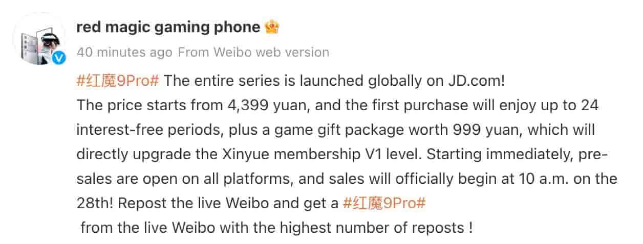 The Dark Knight model of the Red Magic 9 Pro smartphone comes in 8GB/256GB, 12GB/256GB, & 12GB/512GB storage options, and are priced at ¥4399, ¥4799, & ¥5199. The Deuterium Front Transparent Dark Night & Deuterium Front Transparent Silver Wings models come in 12GB/256GB & 12GB/512GB storage options and are priced at ¥4999 & ¥5399.