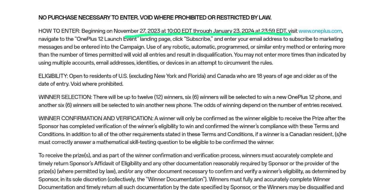 This means that OnePlus will begin accepting the entries from November 27th and will accept till January 23. Now if we were to say that the company will launch the OnePlus 12 simultaneously across all global markets, it might run a giveaway till then. And as soon as it ends it can launch on January 24.