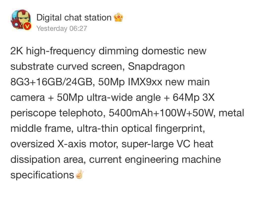He also mentioned that it can come with a Snapdragon 8 Gen 3 processor, a 5,400 mAh battery that supports 100 W charging and 50 W wireless charging.