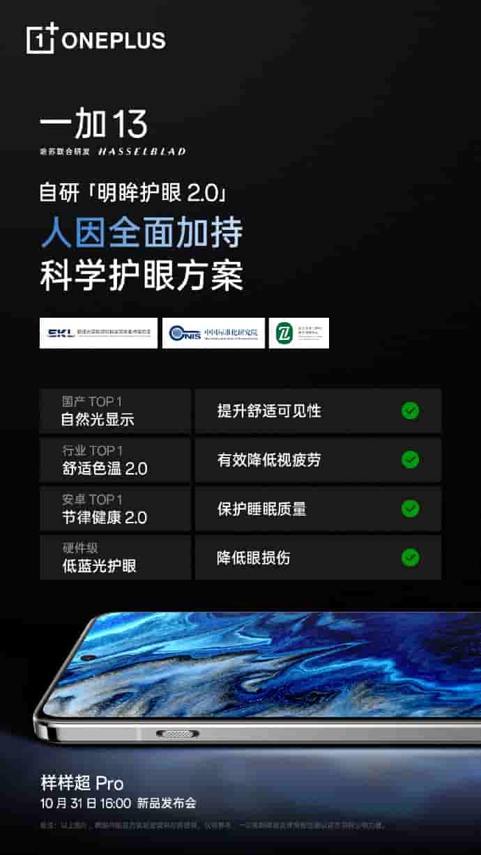 The device features Bright Eyes Eye Protection 2.0 technology that has super pro eye protection capabilities- true full brightness DC dimming support, self-developed Bright Eyes Low Flicker 2.0, and human factor comprehensive scientific eye protection solution. This technology is said to improve comfort and visibility, reduce visual fatigue, protect sleep quality, and reduce eye damage. OnePlus 13 is the industry’s first device to receive a 2K screen German Rhine TUV Intelligent Eye Protection 4.0 certification.