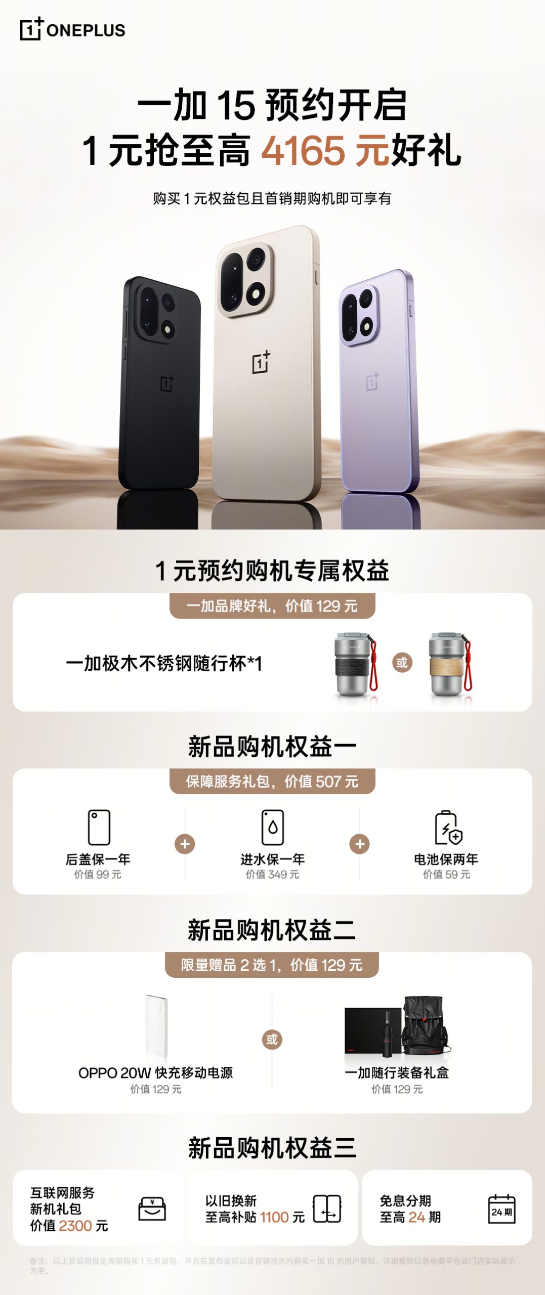 Pre-orders for the OnePlus 15 are now open in China. Consumers can grab gifts worth up to 4165 Yuan for just 1 Yuan. Exclusive benefits include- a OnePlus wood stainless steel travel cup worth 129 Yuan, a guarantee service package worth 507 Yuan, an Oppo 20W Fast Charging Power Bank worth 129 Yuan or a OnePlus Travel gear gift box worth 129 Yuan, internet services worth 2300 Yuan, a Maximum subsidy up to 1,100 Yuan and interest-free installments up to 24 months.