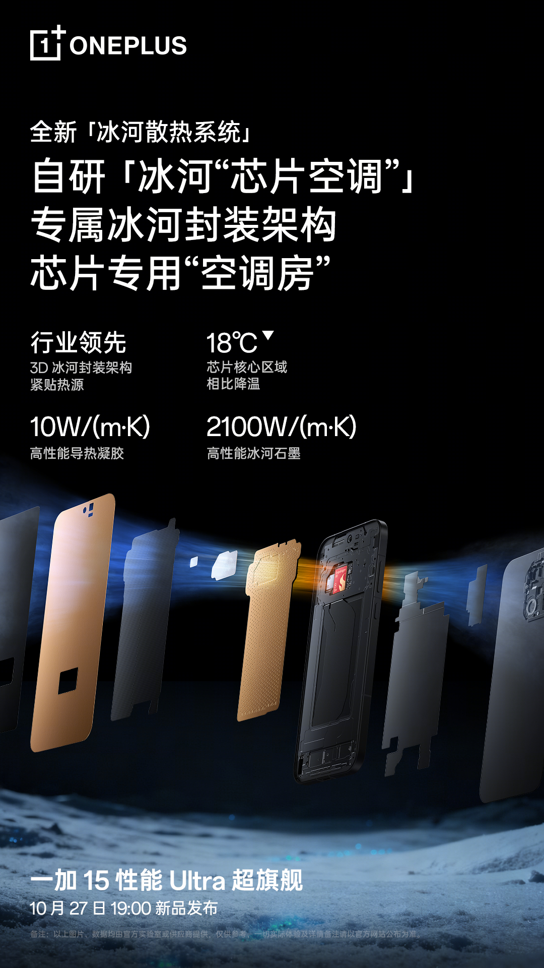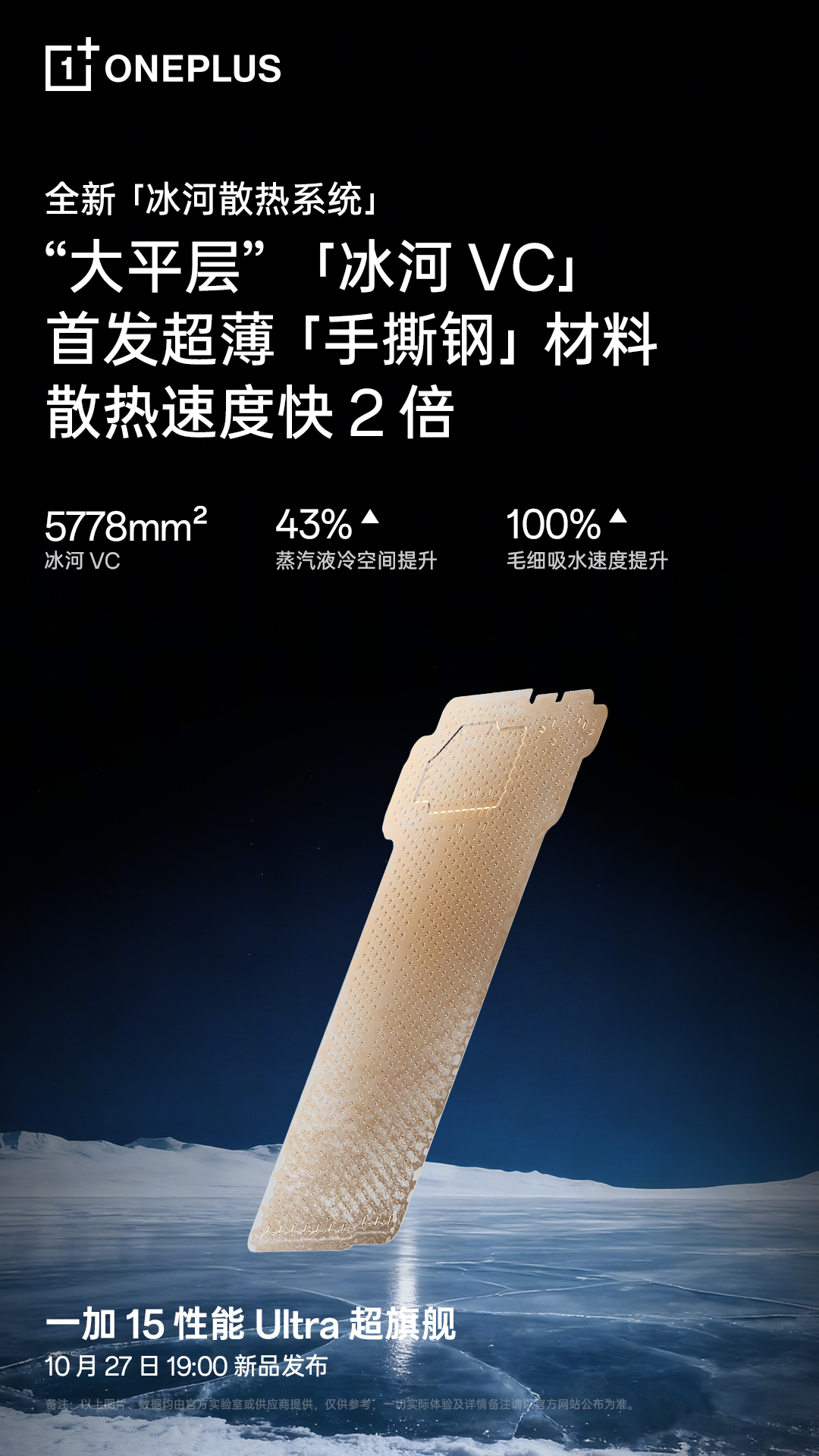 Looking at the teased performance specs, the OnePlus 15 smartphone, to ensure a stable performance delivery, is revealed to feature the brand’s new Glacier Cooling System, and the Full Heat Dissipation Black Technology used promises it. The self-developed Glacier Chip, exclusive Glacier 3D Packaging Architecture, and Chip-only Air-conditioned Room are its associated specs. 18° C reduced core area cooling, 10W/(m·K) high performance thermal conductivity gel, and 2100W/(m·K) high performance glacial graphite are also added aspects. Also, the large ultra-thin hand-torn steel Glacier VC offers 2 times faster heat dissipation, along with 5778 mm² area, 43% increase steam liquid cooling space, and 100% increased capillary water absorption speed.
