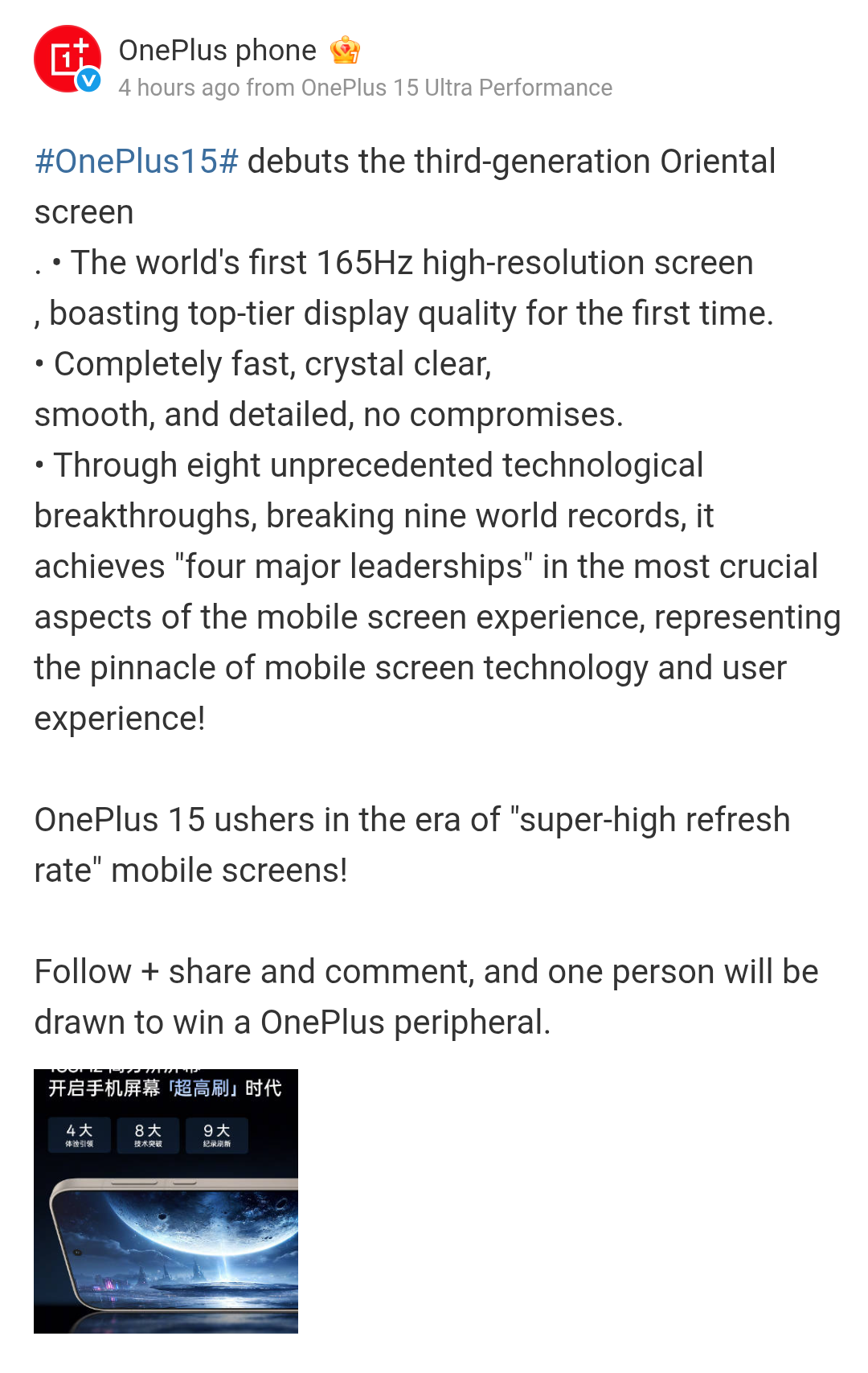 The OnePlus 15 smartphone via the new teaser updates is again pointed out to support a 165Hz refresh rate display, and it will be offering the third generation of Oriental screen. A top-tier display quality that is fast, crystal-clear, smooth, and detailed is also revealed to be among its key specs. Additionally, with eight unprecedented technological breakthroughs and nine new world records, the upcoming flagship has also achieved four major leaderships in the field of mobile display experience.