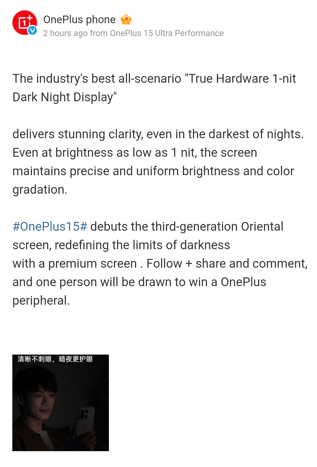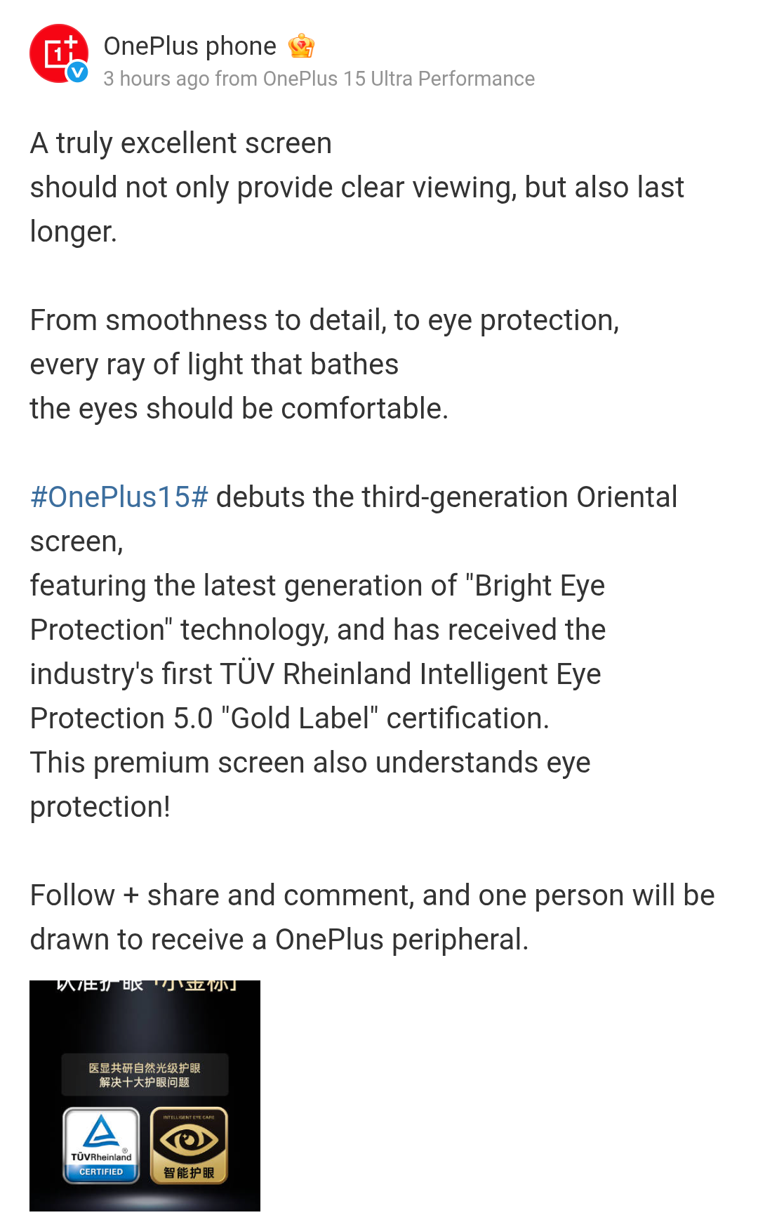 OnePlus 15 Smartphone Display Specs Again Teased: 3rd-Gen Oriental Screen, 1-nit Low Brightness Rate, TUV Rheinland Intelligent Eye Protection 5.0 Gold Label Certification, and More Revealed