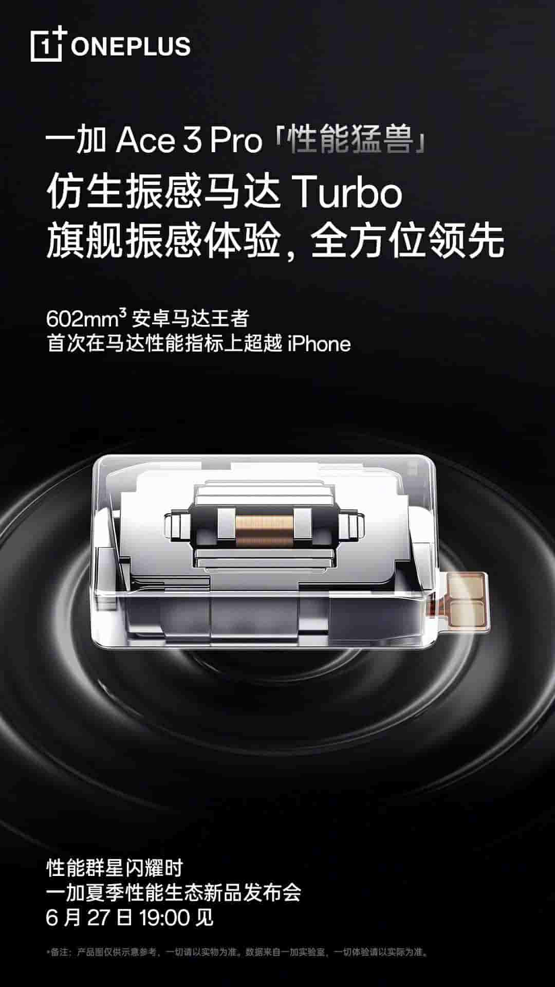OnePlus Ace 3 Pro will be featuring the largest bionic vibration motor Turbo in any Android device. It will be equipped with a 602mm3 motor which as claimed by the company surpasses the iPhone in motor performance indicators for the first time.
