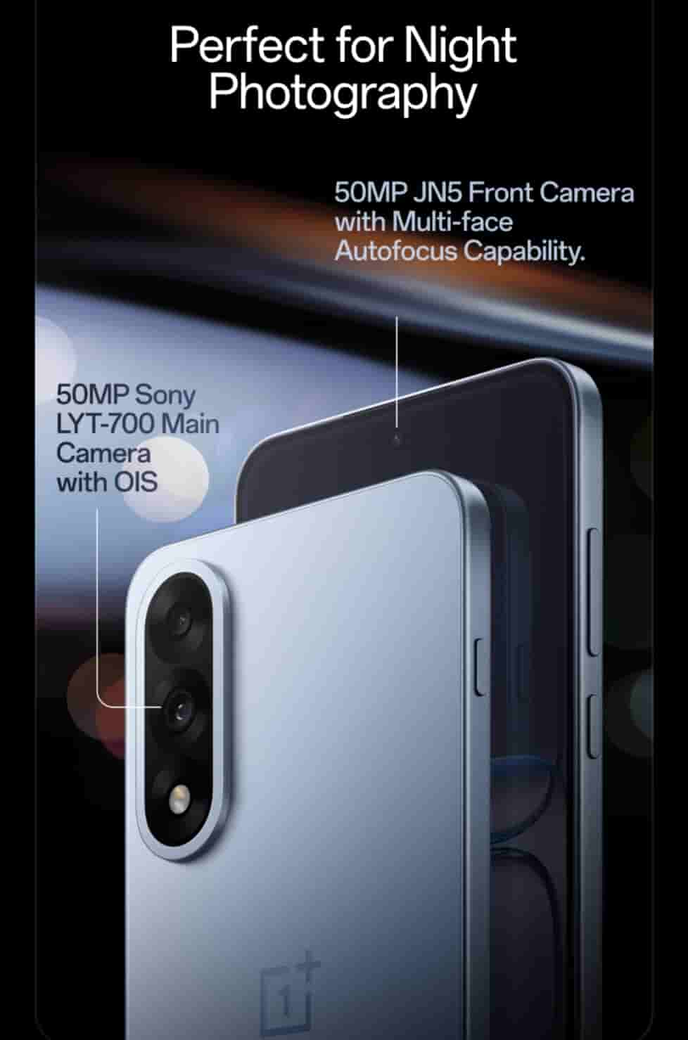 The smartphone features a 50MP Sony LYT-700 main camera with OIS support on the rear side, while on the front it packs a 50MP JN5 selfie camera with multi-face autofocus capability.