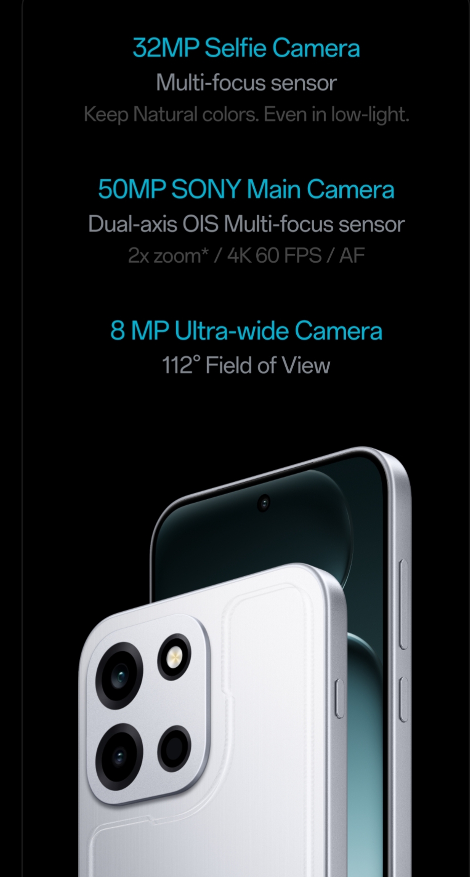 The smartphone packs a 50MP Sony main camera ( dual-axis OIS multi-focus sensor) with 2x zoom, AF and 4K 60fps support, and an 8MP ultra-wide camera with 112-degree field of view on the rear side, while on the front it features a 32MP selfie camera (multi-focus sensor).
