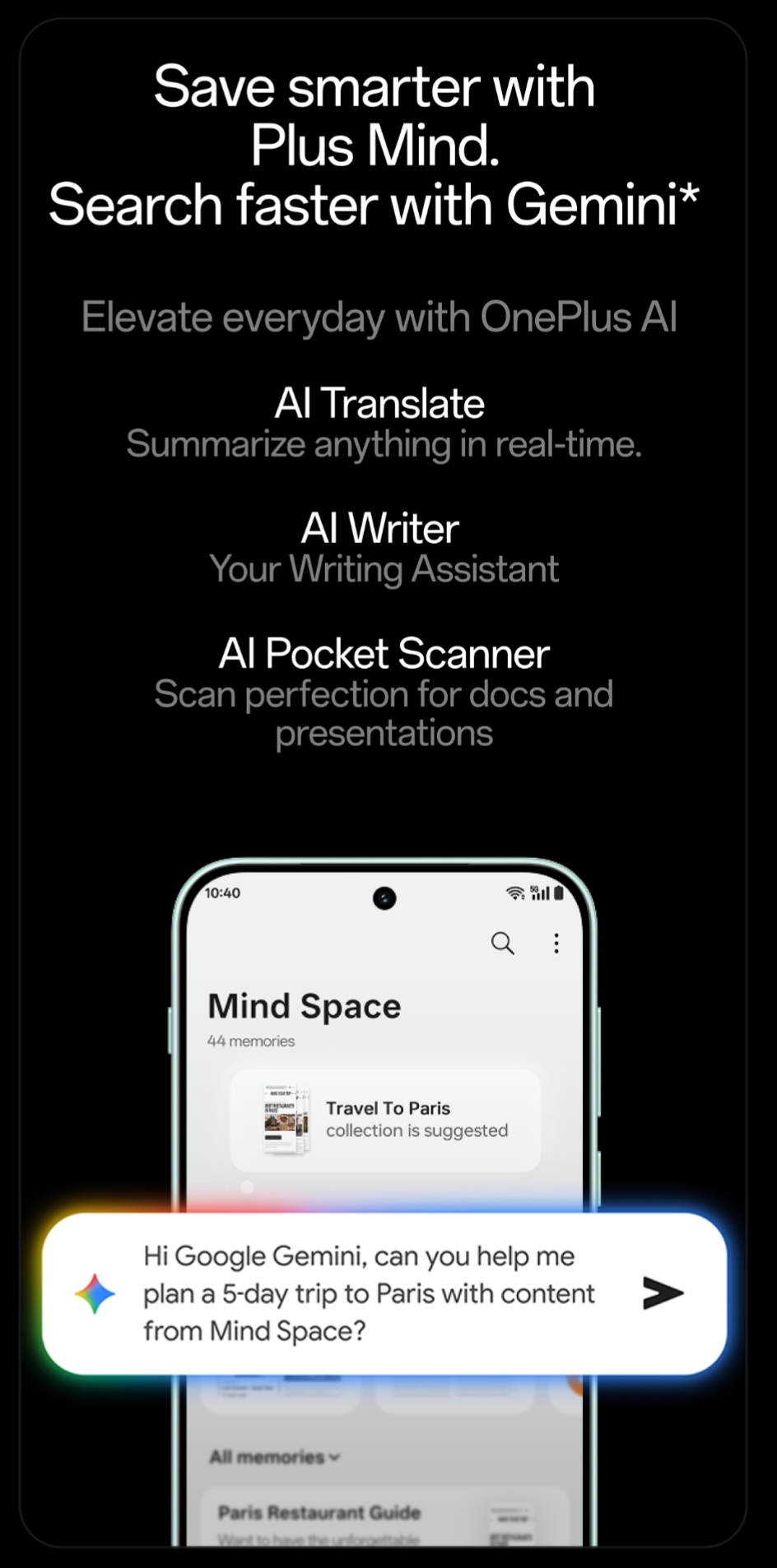 Users can save their work with Plus Mind and search faster with Gemini. OnePlus AI features include- AI Translate, AI Writer and AI Pocket Scanner. The device comes with an IP66/68/69/69K rating and US military-grade standards.