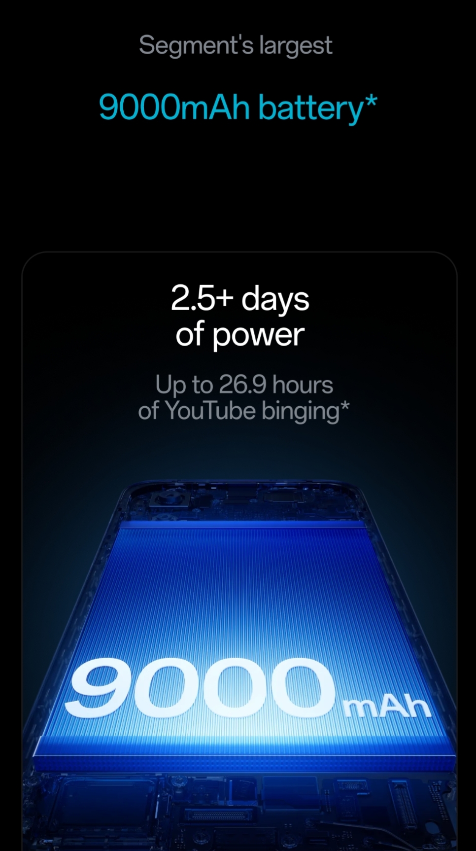 The smartphone is backed by a 9000 mAh battery and offers 2.5+ days of power and up to 26.9 hours of YouTube binging. It sports an OLED display that offers a 165Hz refresh rate, 1800 nits brightness and 2 nits brightness for midnight scrolling. It is equipped with a G2 Wi-Fi chip and comes with 5G-advanced support. With the Wi-Fi booster chip & 5G-Advanced support, the device provides 3x internet speed, full-force connectivity 24/7 and up to 1.6x lower ping for gaming through walls & floors.