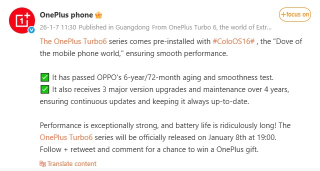 The OnePlus Turbo 6 series is all set to break cover on January 8th, with the launch scheduled for 7:00 PM (China local time). Ahead of the official announcement, OnePlus has revealed most of the key specs of the OnePlus Turbo 6V, along with the software update policy for the series.