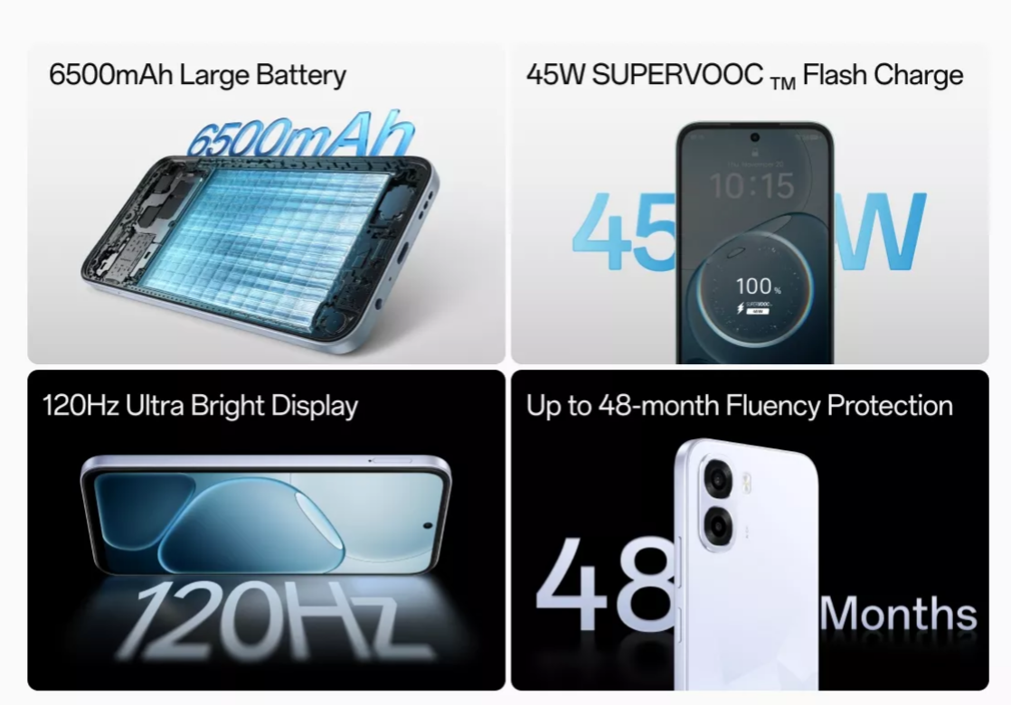 The device packs a 50MP main camera and a 2MP monochrome camera on the rear side, while on the front it features a 5MP selfie camera. It is backed by a 6500mAh battery and supports 45W SUPERVOOC charging and reverse wired charging. It weighs 212g and measures 16.66×7.85×0.85cm.