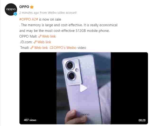 After making an appearance on different certification websites, Oppo A2 was officially launched in the Chinese market a few days back. Earlier it was reported that the device was available for sale from the launch day itself but today the smartphone brand has officially announced that the smartphone is available for sale from today onwards in China.