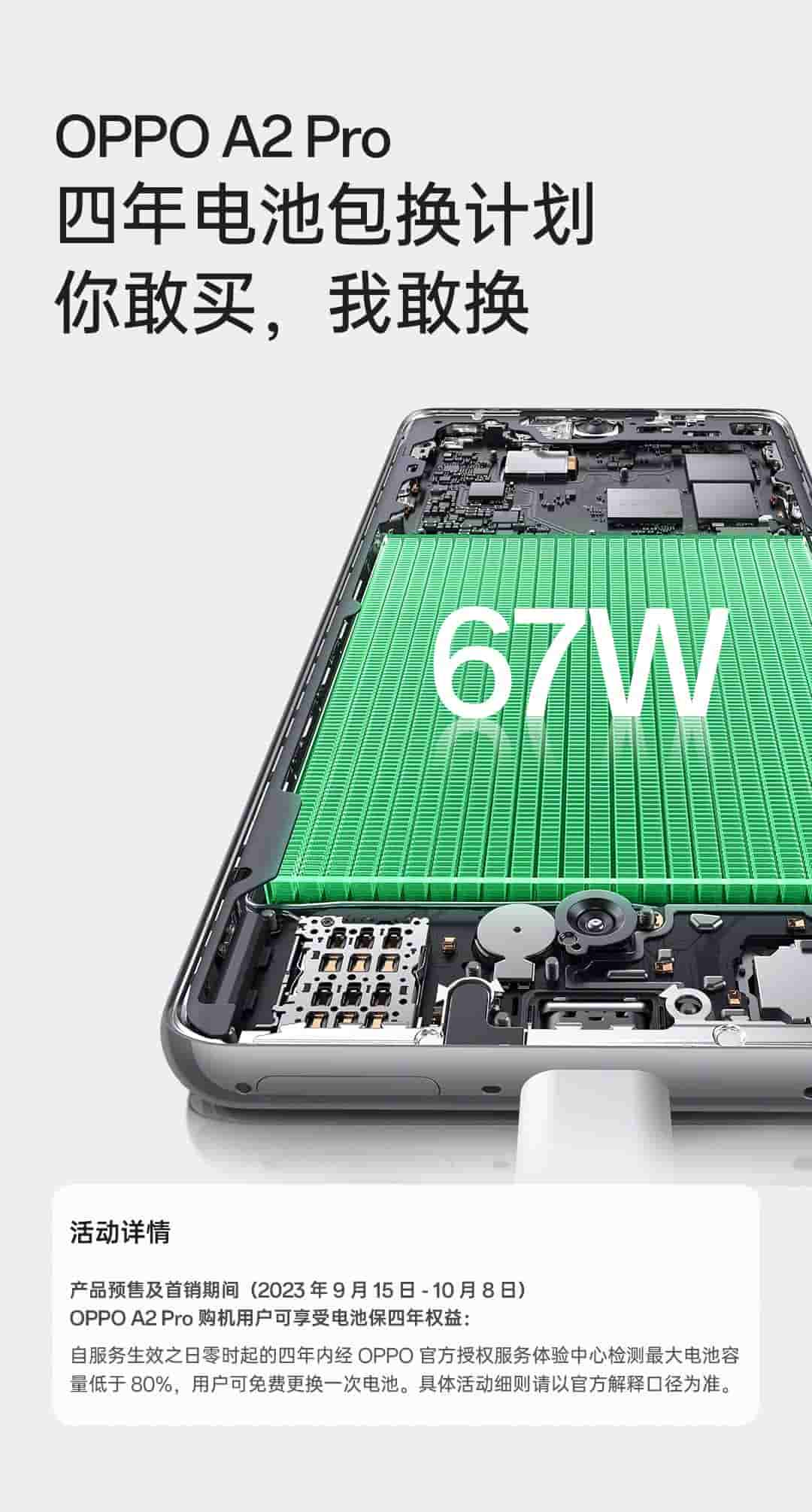 In addition, OPPO confirmed that the OPPO A2 Pro 5G has the Dimensity 7050 chipset, 12 GB of RAM, 12 GB of virtual RAM, and 67W fast charging. During the pre-sale and initial sales period, which spans from Sept. 15 to Oct. 8, customers who purchase the OPPO A2 Pro will be entitled to a four-year warranty specifically covering the battery.