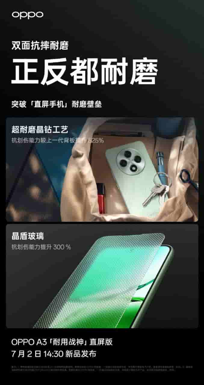 Today Oppo has officially revealed on the Weibo platform that the Oppo A3 smartphone will be arriving with a double-sided anti-fall and wear-resistant body.