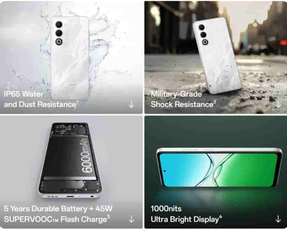 The device is backed by a 6000 mAh battery and supports 45W SUPERVOOC fast charging. It packs a 50MP main camera and a 2MP monochrome camera on the rear side, while on the front it features a 5MP selfie camera. Other features include dual-view video, facial recognition, optical fingerprint sensor, dual SIM, WiFi 5, Bluetooth 5.0, USB-C port, 3.5mm jack, IP65 rating, Military Grade Standards, ultra volume mode, outdoor mode, glove touch, AI features, Trinity Engine, and 6GB virtual RAM.
