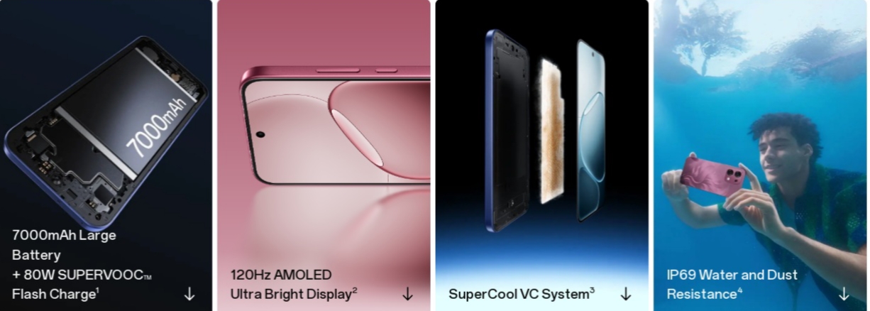 Both smartphones feature a 6.57-inch AMOLED display that offers FHD+ screen resolution, up to 120Hz refresh rate, maximum 240Hz touch sampling rate, 100% DCI-P3 color gamut,1400 nits HBM, and 1.07 billion colors. They run on ColorOS 15.0. The devices are backed by a 7000 mAh battery and support 80W SUPERVOOC fast charging.