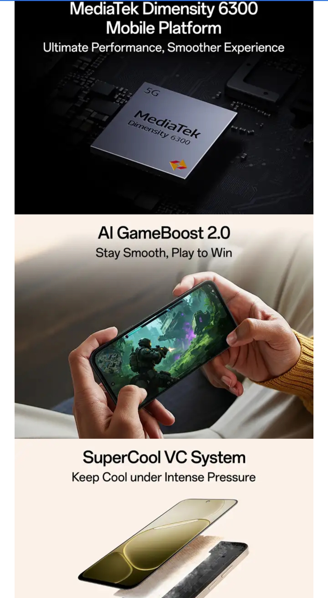 Other features include- side fingerprint sensor, facial recognition, dual SIM, WiFi 5, Bluetooth 5.4, USB Type-C port, IP69/IP68/IP66 rating, 3900mm2 SuperCool VC System, 60-month fluency protection, 5 years durable battery, spray water removal feature, Smart RAM expansion, AI GameBoost 2,0, AI LinkBoost 3.0, dual stereo speakers+ ultra-volume mode, outdoor mode 2.0, GloveTouch, underwater photography, AI Camera features, Trinity engine, Luminous rendering engine, and Theft Protection.
