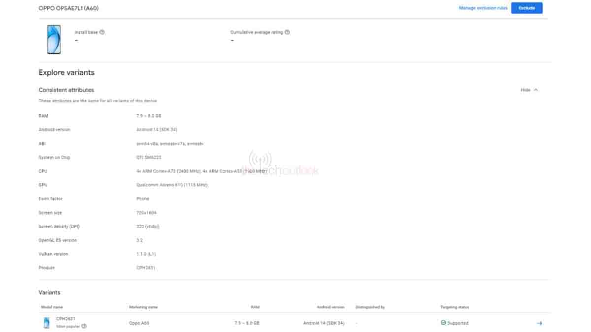 Oppo has just announced its new A-series smartphones, the A1s and A1i, in its home country, China. It looks like we may soon see a new A-series smartphone entering the global market. This is none other than the Oppo A60, which was recently spotted on SIRIM, TDRA, TKDN, TUV Rheinland, EEC, NBTC, SDPPI, and FV5. A new listing on the Google Play console now reveals the key specs, including the processor that will power this smartphone.