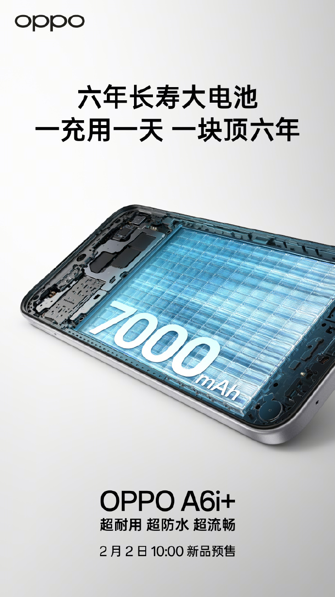 In a new teaser posted on Weibo, Oppo confirms that the Oppo A6i+ will come with a bigger 7,000mAh battery, compared to the 6,500mAh battery on the Oppo A6V. Oppo also confirms that both smartphones’ batteries will offer a lifespan of up to six years. Adding more, it has also confirmed that the Oppo A6i+ will come with IP69-rated protection.