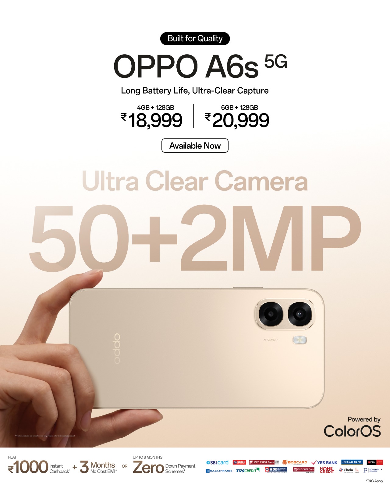 “At OPPO India, our strategy is centered on democratising meaningful innovation and making premium experiences accessible to a wider audience. With the OPPO A6s 5G, we are reinforcing the A Series as a benchmark for dependable performance and long-lasting smoothness in its segment. This launch reflects our long-term commitment to building devices that address real consumer priorities — clear and high-quality imaging, powerful yet efficient performance, and reliable all-day battery life. As we continue to strengthen our portfolio in India, the A6s 5G plays a key role in expanding our 5G ecosystem while delivering consistent, everyday advantages that users can truly rely on”— Goldee Patnaik, Head of PR & Communications, OPPO India.