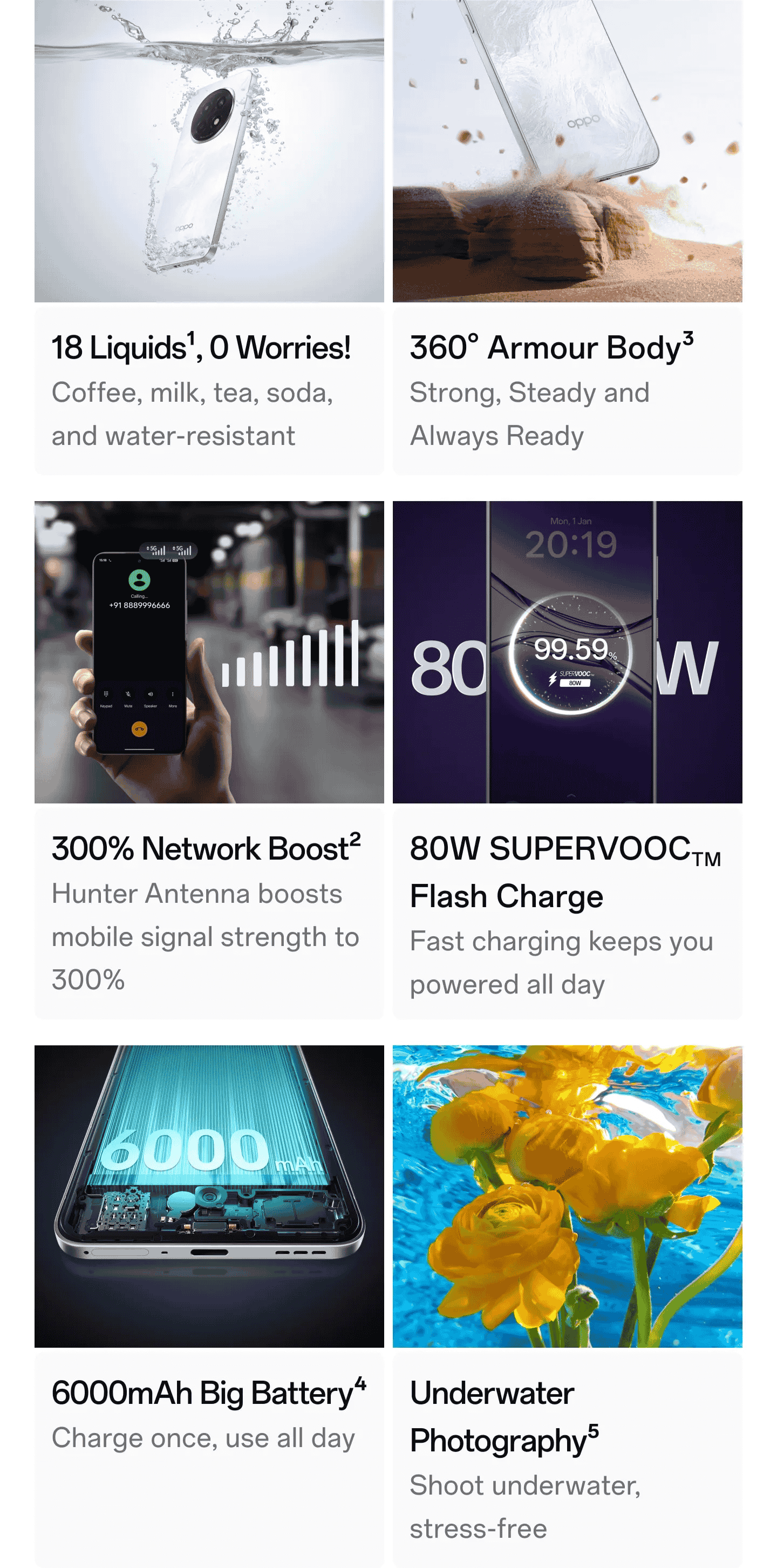 Other features include: in-display optical fingerprint sensor, WiFi 6, Bluetooth 5.4, 360 degree armour body, 300% network boost, underwater photography, durable & 18 liquid proof, IP69/IP68/IP66 rating, dedicated gaming antenna, 8GB virtual RAM, dual stereo speakers with 300% amplified sound, love mode, works even with wet hands, crystal clear 4K recording, AI Image Assistant, MIL-STD certification, Oppo AI features, clear voice feature and instant translation feature.