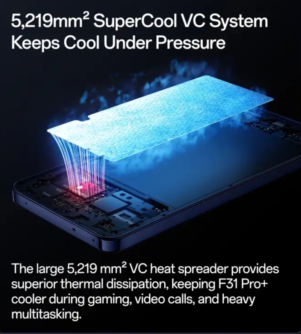 The Oppo F31 Pro+ smartphone will be powered by 5,219mm2 SuperCool VC System. The series is teased to offer an ultra-smooth experience with 0 lag, 0 latency, 0 flicker, 0 crash, 0 mislaunch, and 0 freeze. It arrives with Outdoor Mode 2.0, hunter antenna structure, and AI LinkBoost 3.0.