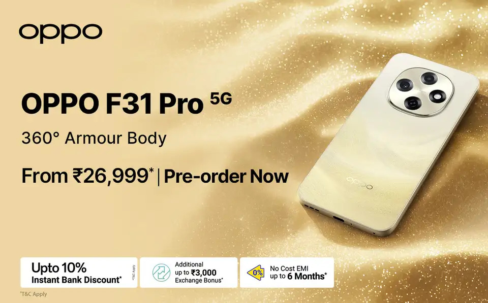 The OPPO F31 Pro is priced at ₹26,999 for 8GB+128GB, ₹28,999 for 8GB+256GB, and ₹30,999 for 12GB+256GB. It will be offered in Desert Gold and Space Grey colour finishes.