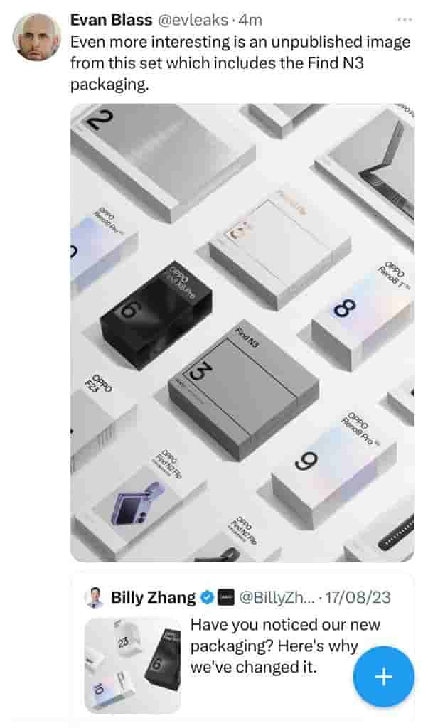 The update comes from Evan Blass(@evleaks), a tipster on the Twitter platform, who has shared an image with many packaging boxes for different OPPO smartphones, amongst which, we can spot the packaging box for the upcoming Find N3 foldable.