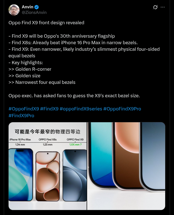 As per the new updates that have been reported, OPPO is said to introduce its Find X9 smartphone as the brand’s 30th anniversary flagship and in comparison to the April 2025-released Find X8s that had previously beaten Apple’s iPhone 16 Pro Max device in terms of narrow bezels, the upcoming Find X9 smartphone will be offering even narrower bezels. It is also suggested that possibly, the OPPO Find X9 will be featuring the industry’s narrowest symmetrical bezels. [To note: OPPO Find X8s – 1.25mm bezels; Apple iPhone 16 Pro Max – 1.34mm bezels].