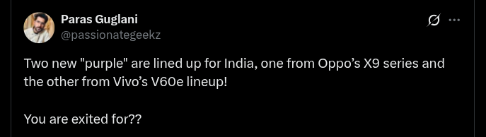 In related news, as per the X post shared via @passionategeekz, two smartphones (two new ‘purple’) are tipped to launch soon for Indian customers. He notes that one of them is from the OPPO Find X9 series, while the other is from the Vivo V60e lineup.