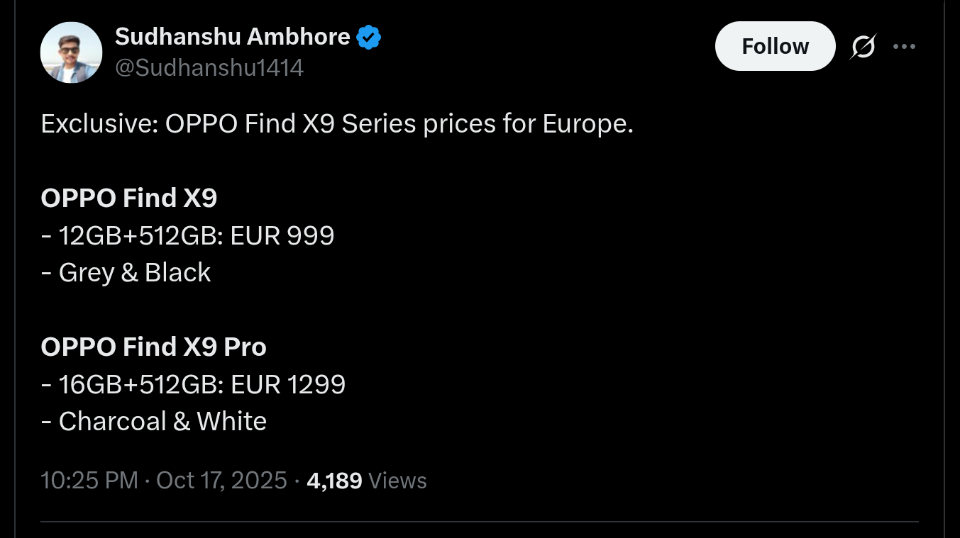 Speaking about the European pricing details, the standard OPPO Find X9 smartphone with a storage option of 12GB/512GB is tipped to carry a price tag of EUR 999, and it is mentioned to be made available in Grey and Black colors. For the OPPO Find X9 Pro, it is stated to be offered in 16GB/512GB storage option with a price tag of EUR 1299. Charcoal and White colorways are suggested for the pro model.