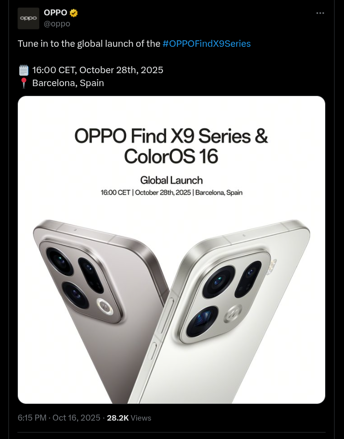 Early last month in September 2025, the global launch for the OPPO Find X9 series was tipped and just like what was revealed previously, it will be taking place on the 28th of October 2025. The launch event will be held in Barcelona, Spain at 16:00 CET and the ColorOS 16 custom skin based on the Android 16 operating system will also be unveiled for global consumers on the same day. To note, the shared teaser poster also points out that the Frost White and Velvet Titanium can be expected. [In related news, the India launch for the OPPO Find X9 series was also tipped to happen next month in November 2025.]