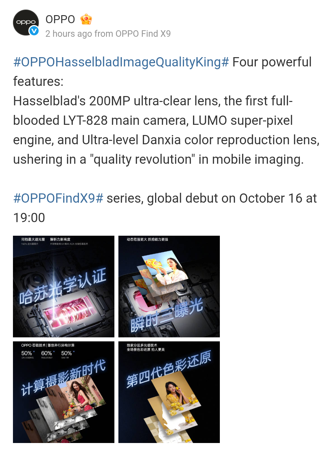 The OPPO Find X9 series has again been teased to feature Hasselblad’s 200MP ultra-clear lens, Sony LYT-828 main camera (for the first time), LUMO super-pixel engine, and the ultra-level Danxia color reproduction lens. Moreover, the brand claims these to be a ‘quality revolution’ in mobile photography. Speaking more, the Hasselblad 200MP ultra-clear lens will offer more light intake (140% increase), and it uses the 0.1 micron AOA optical axis alignment technology. Sony’s LYT-828 main camera will bring a wider dynamic range and better capture capabilities too.