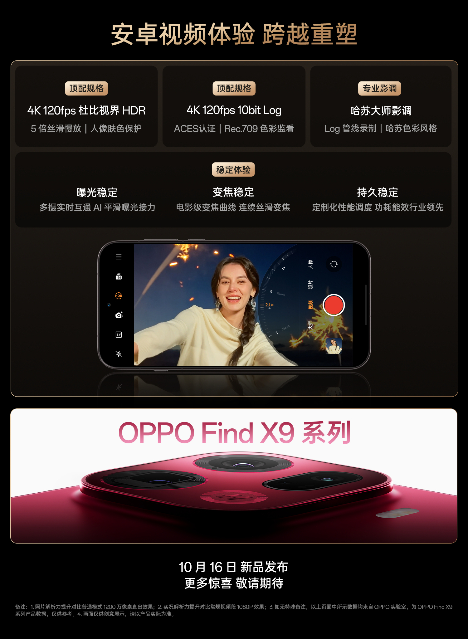 An upgraded Hasselblad experience with new generation XPAN mode and Master mode, OPPO Hasselblad professional teleconverter, 4K 120fps Dolby Vision HDR, 4K 120fps 10-bit Log, and stable experience (stable exposure, stable zoom) are other teased camera related features.