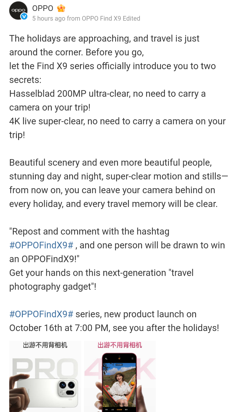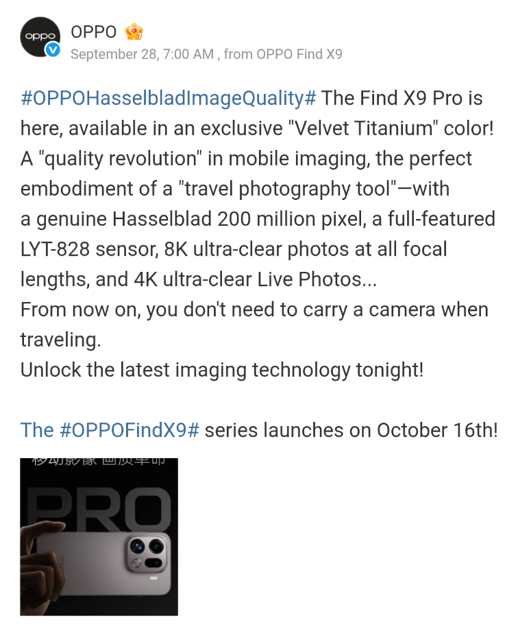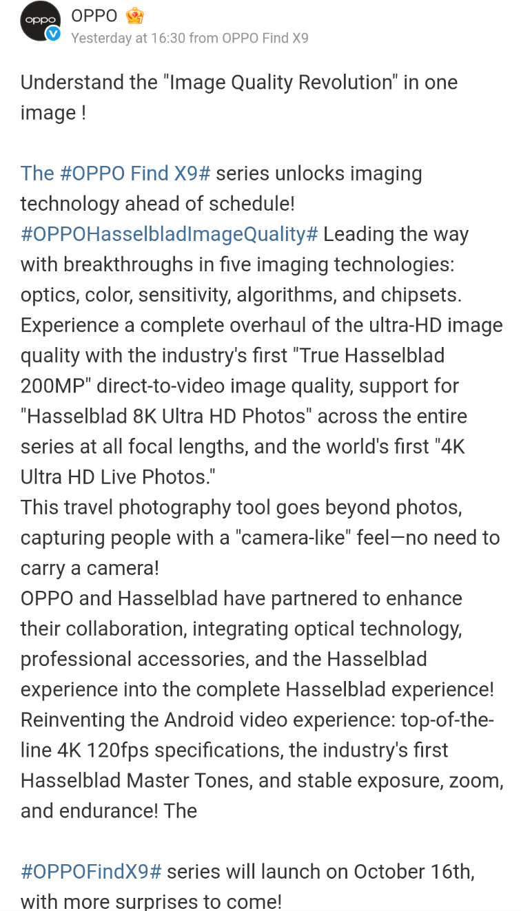 OPPO Find X9 Series Camera Specs Teased Again: Hasselblad 200MP Camera System, 4K Live Photos, 8K Photos, LYT-828 Sensor, and More Revealed