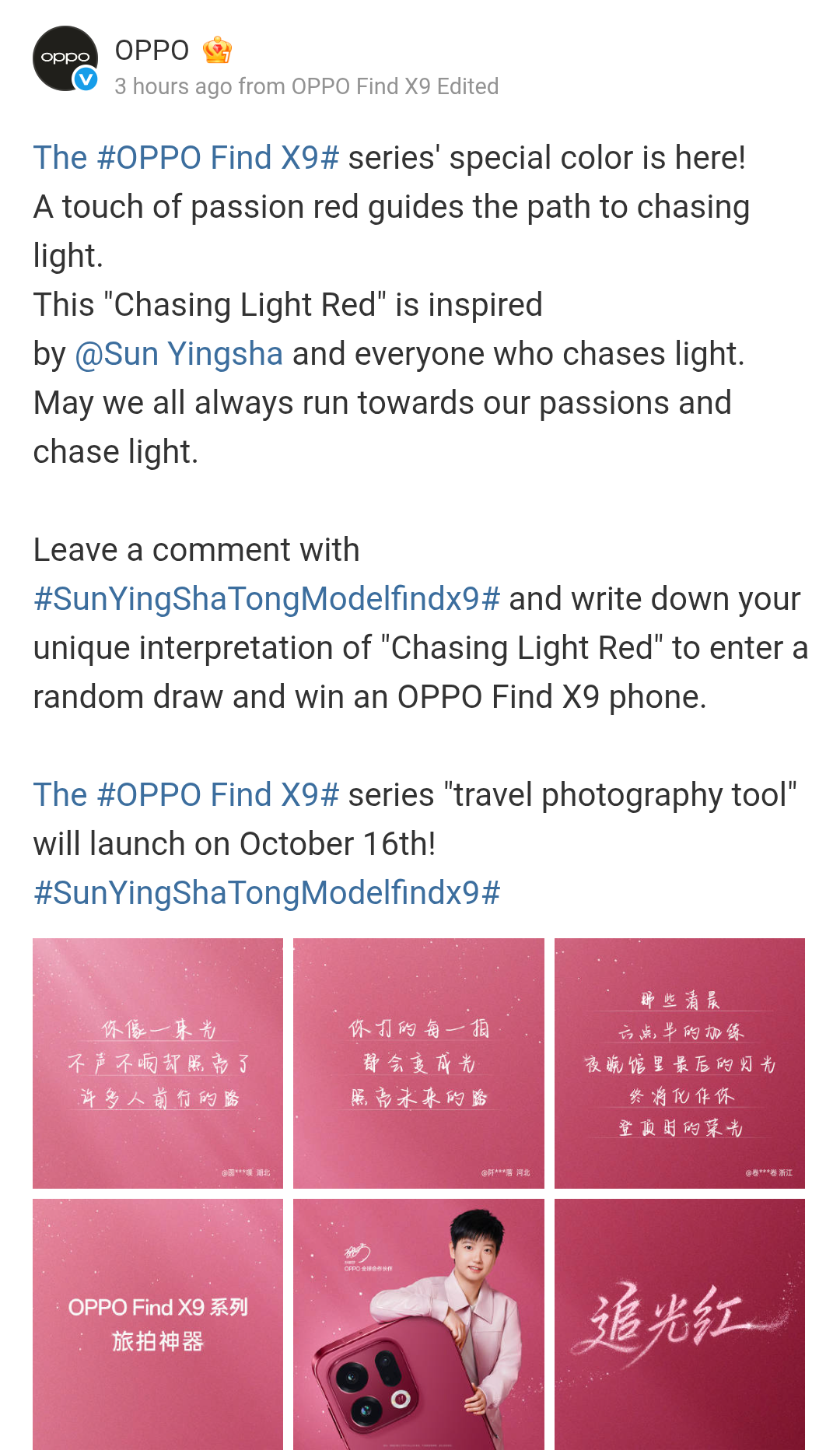 Firstly, the special ‘Chasing Light Red’ color that will be offered for the upcoming OPPO Find X9 series has again been teased, and it seems that OPPO plans to market its latest flagship series with this color variant. The teaser poster also portrays Sun Yingsha – OPPO brand ambassador with a Chasing Light Red Find X9 series smartphone.