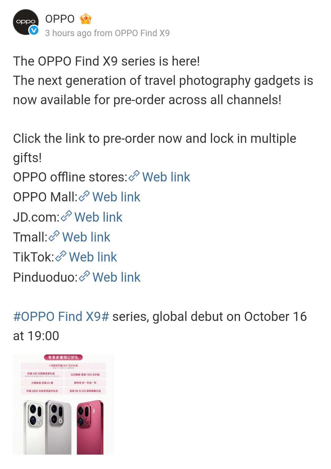 The pre-orders across all channels (OPPO offline stores, OPPO Mall, JD.com, Tmall, TikTok, Pinduoduo) are also live for the standard editions. Moreover, we again get to see the three color choices that will be made available for the OPPO Find X9 series in the shared teaser poster.