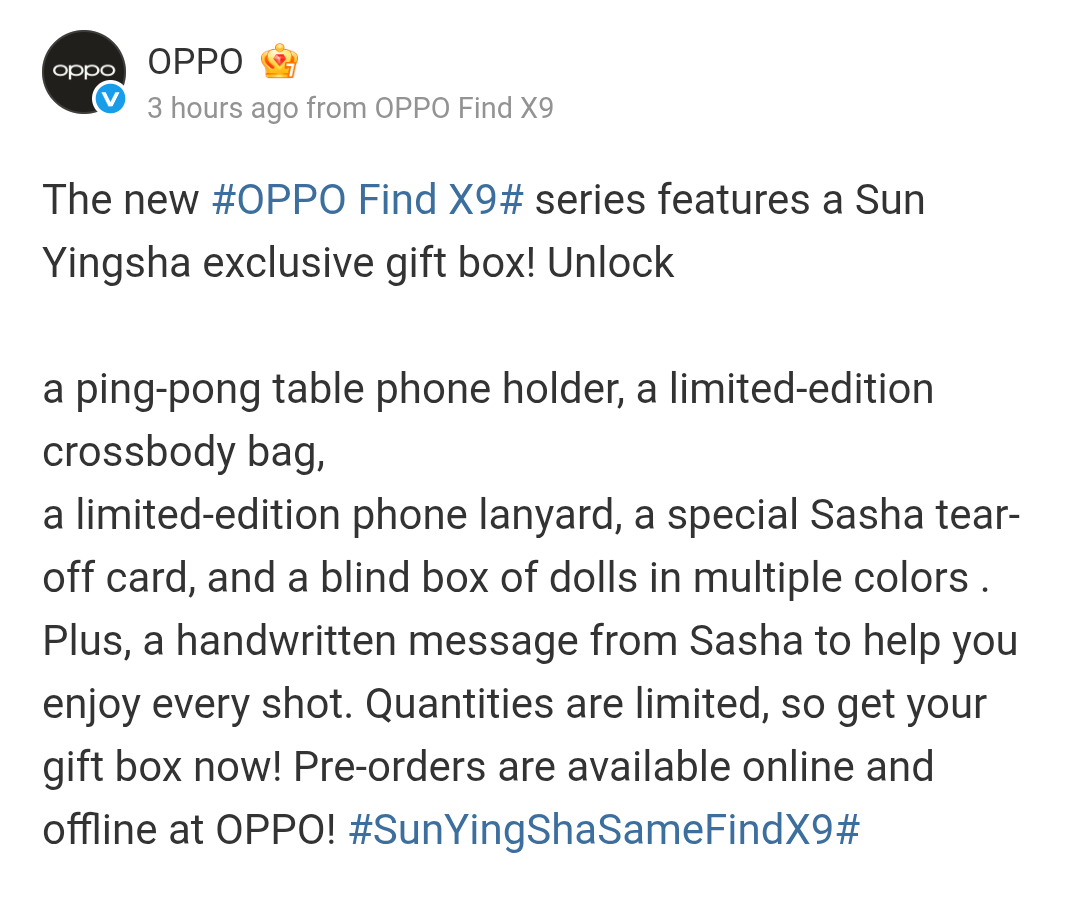A Sun Yingsha exclusive gift box will also be made available for the OPPO Find X9 series, and it will consist of a ping-pong table phone holder, limited edition cross body bag, limited edition phone lanyard, special Sasha tear-off card, hand-written message from Sasha, and a blind box of multiple-colored dolls. It is only available in a limited quantity, and its pre-orders are now live via online and offline modes.