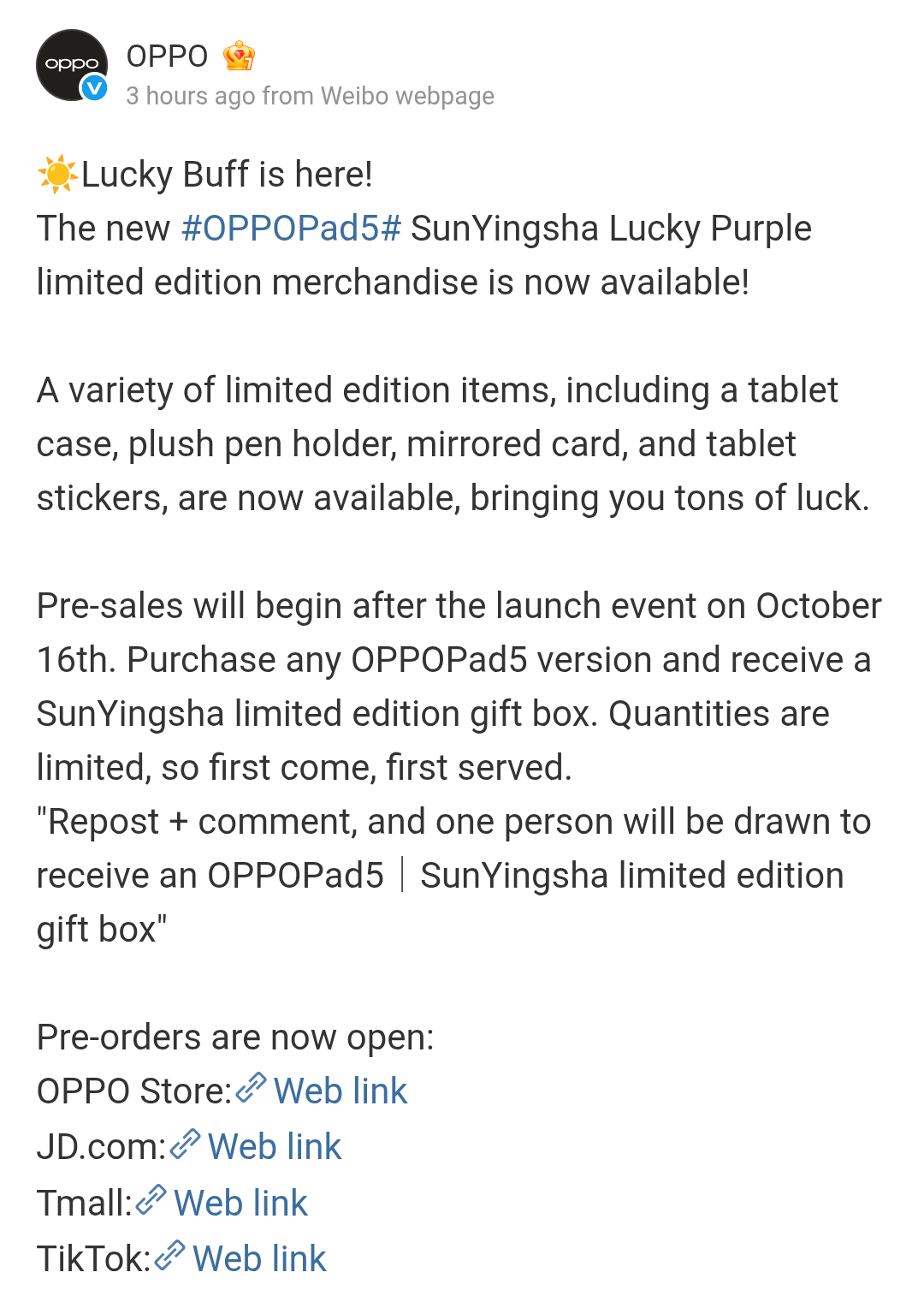 Additionally, a OPPO Pad 5 Sun Yingsha Lucky Purple limited edition merchandise will also be made available and it will bring in a variety of limited edition items. These include a tablet case, plush pen holder, mirrored card, and tablet stickers. Its pre-sale will begin after the launch that has been scheduled for next week, and its pre-order is now live via multiple channels (OPPO Store, JD.com, Tmall, TikTok).