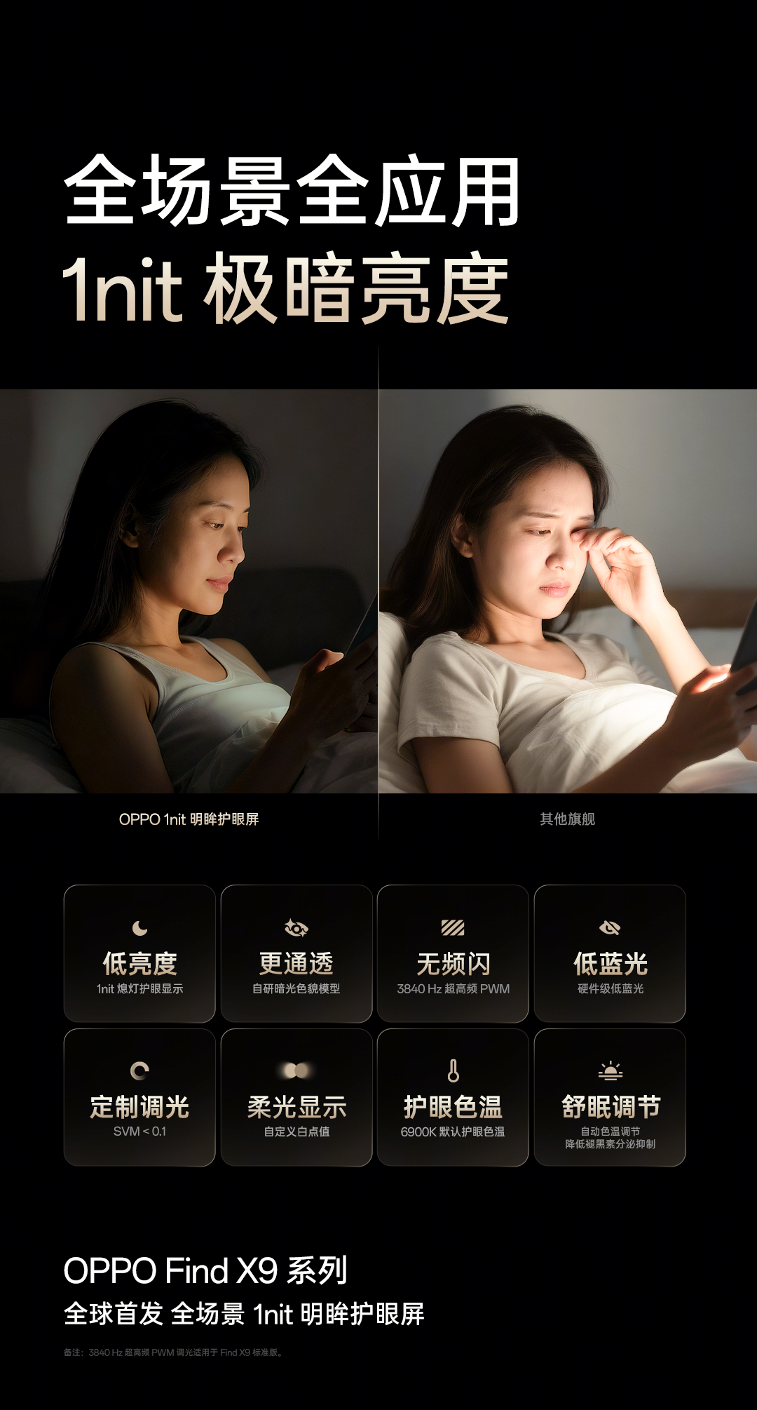 As per the newly-shared teasers, the OPPO Find X9 series is now claimed to feature the world’s first all-scenario 1-nit eye-protective display screen. Features such as a self-developed dark and light color model, flicker-free 3840Hz frequency dimming, hardware-level low Blue light protection, custom dimming SVM <0.1, custom White point value, 6900K default eye protection color temperature, and automatic color temperature adjustment (for reduced melatonin secretion suppression) are thus offered as part of it.