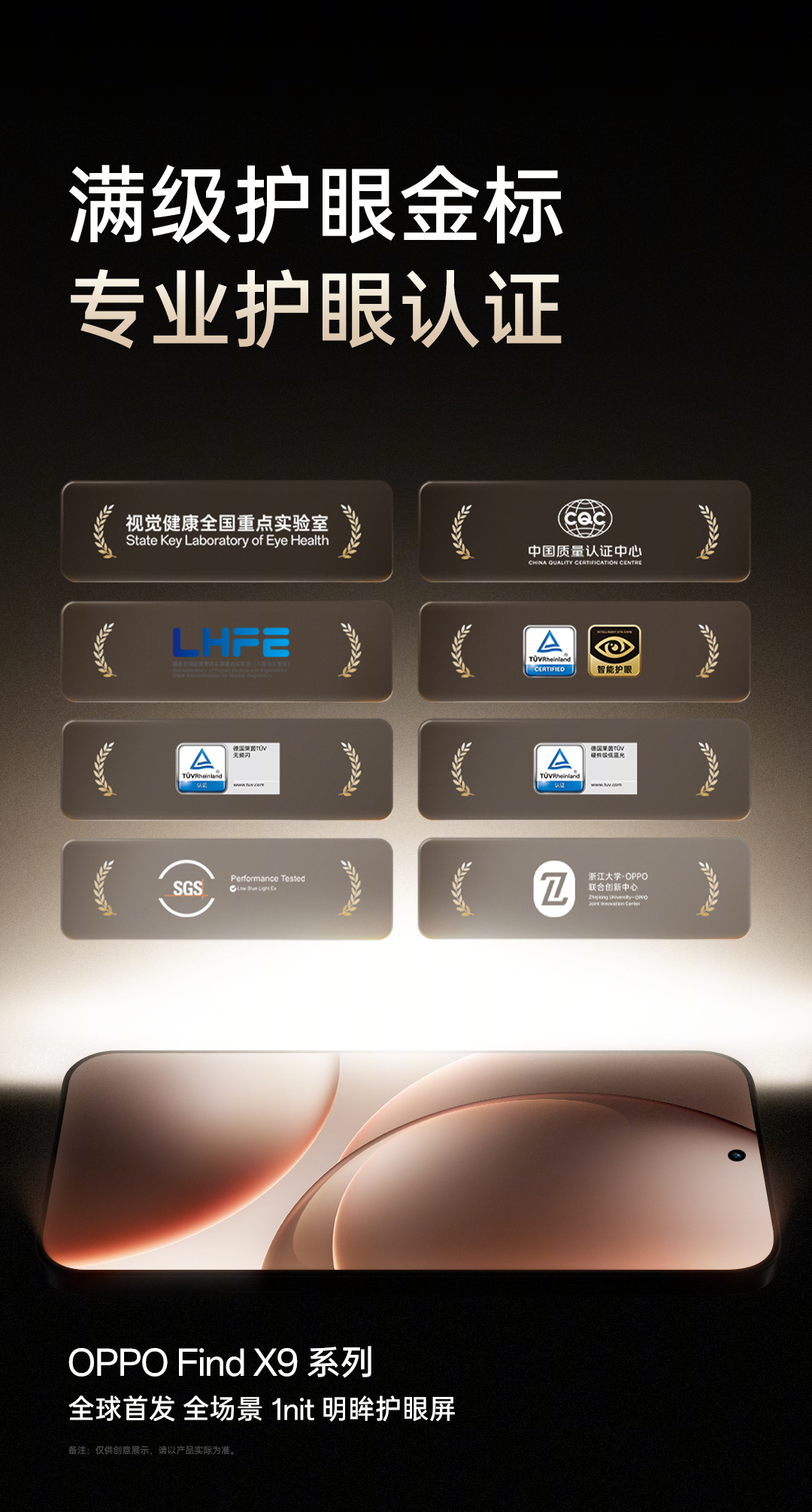 Notably, OPPO’s Find X9 series has also achieved the first SoC chip-level display driver solution too. A dual core synergy is being promised thanks to the brand’s own P3 display chip and MediaTek’s 3nm chip (possibly the Dimensity 9500) combination. The display also supports a 12-bit 60 billion color precision with zero-latency processing, and OPPO and MediaTek have worked together in developing the display algorithms. Furthermore, the OPPO Find X9 series display has been certified with full-level eye protection gold label professional eye protection and it has received certifications from the State Key Laboratory of Eye Health, China Quality Certification Center, LHFE, TUV Rheinland, and SGS authorities.